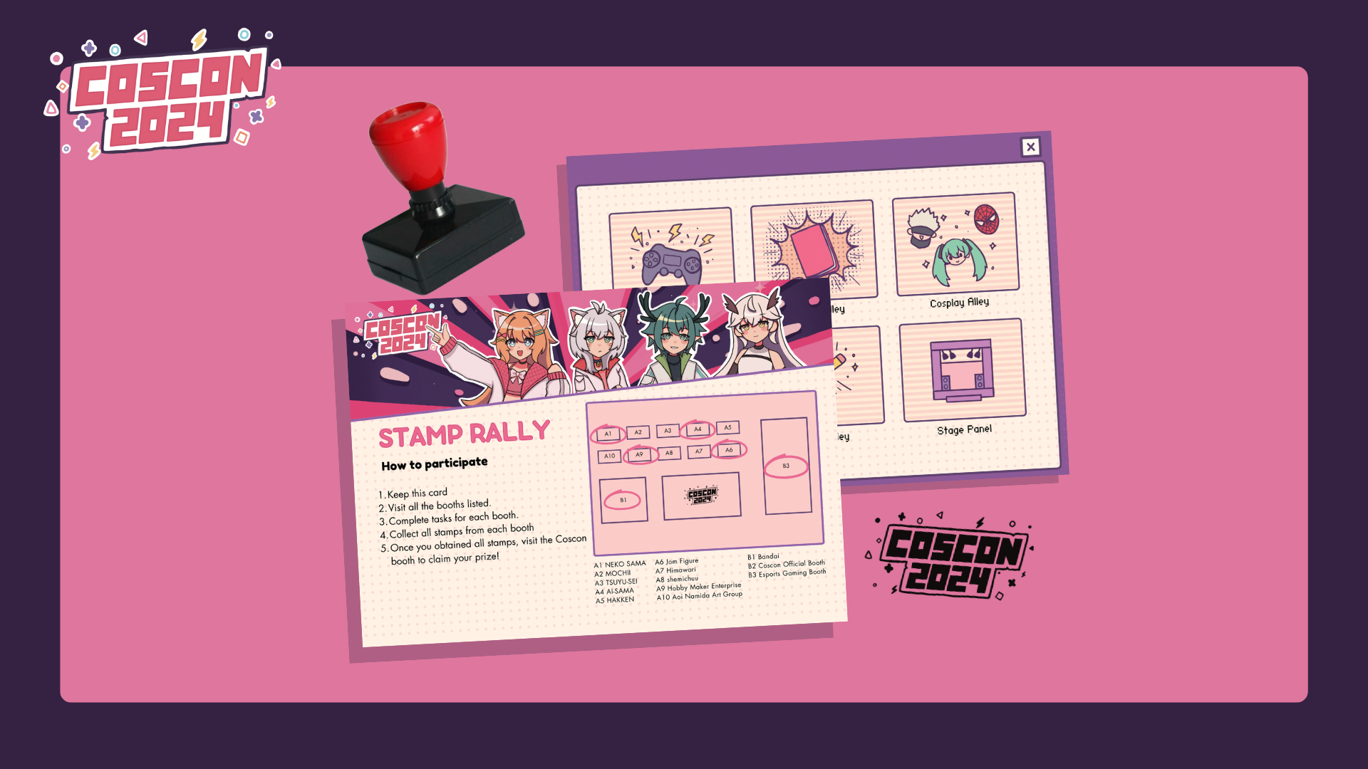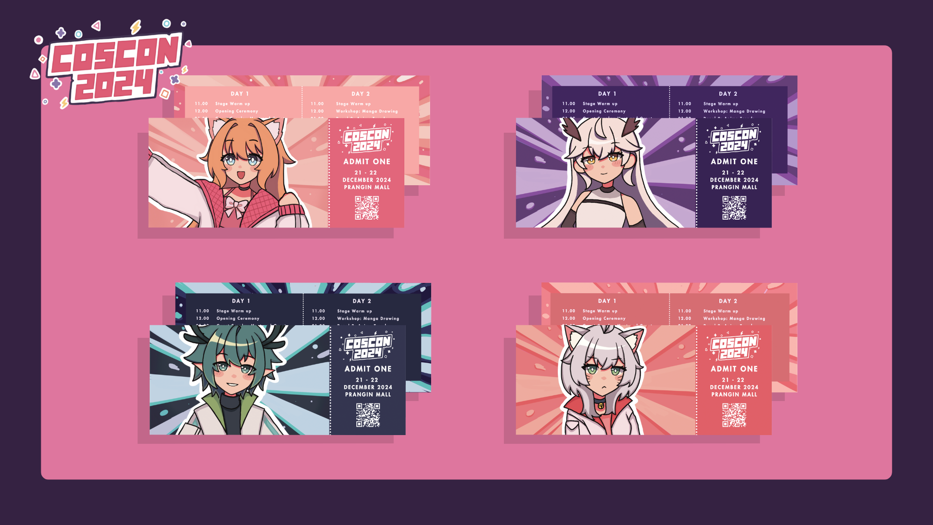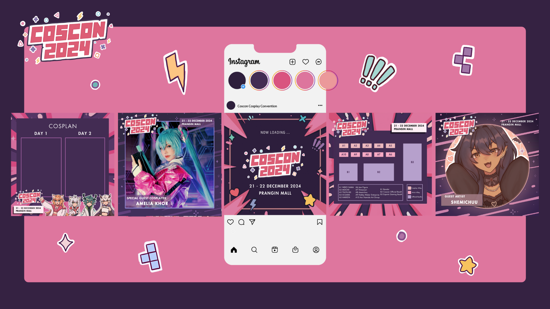 Coscon Cosplay Convention is an ACG (anime, comics, and games) convention in Penang. My project is to create a memorable and recognizable visual identity for a new Coscon event which will help attract ACG and Non ACG fans. For my project, I have designed the banner and social media posts that will promote the convention and share updates on the event. The graphics and design will have a clear theme which will bring out the concept and feel of the ACG event. I also worked on creating exclusive merchandise such as stickers, acrylic standees, keychains, tote bags, lanyards and mousepads that features Coscon's mascots.