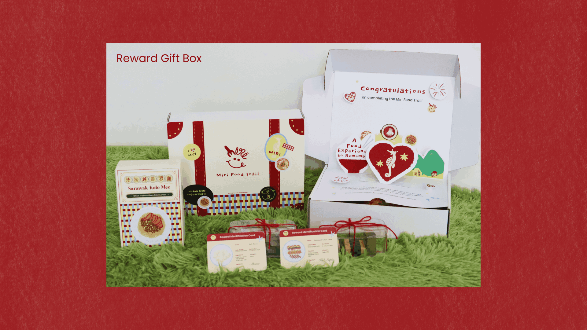 "Miri Food Trail" is an interactive food trail designed to promote Miri as a tourist destination through Sarawak’s delicacies. Participants embark on a gastronomic journey guided by a carefully designed map and digital platform, transforming the experience into not just a trail but also a celebration of Sarawak delicacies. Upon completing the trail, participants are rewarded with an exclusive gift box — a curated collection of souvenirs. The artwork combines visual aesthetics with Sarawak's culinary heritage, featuring patterns inspired by Sarawak Traditional Woven Bags. The harmonious blends of the visuals and engaging content entices participants to explore the cultural significance of each Sarawak delicacies.