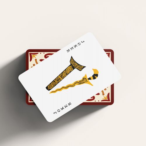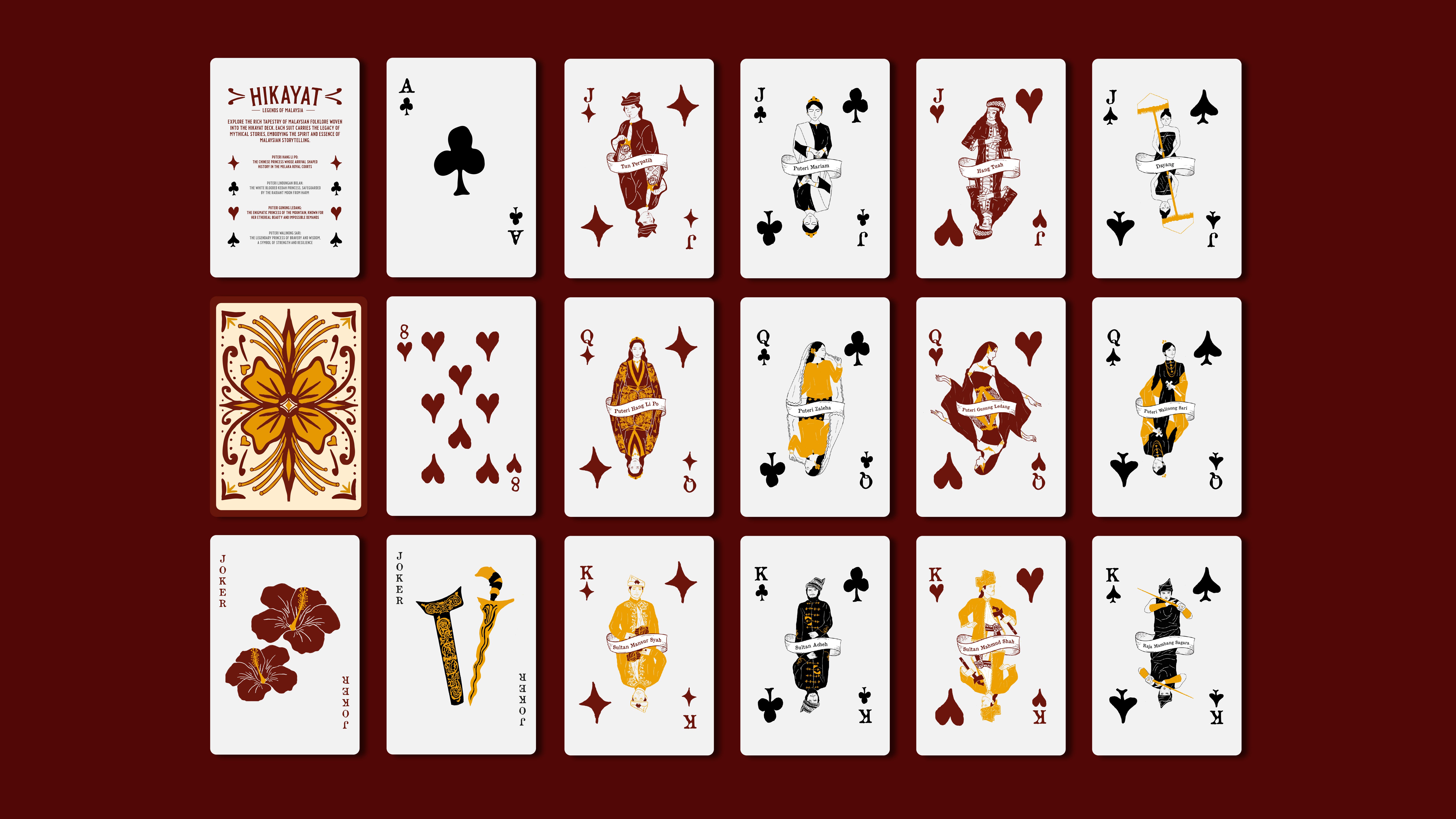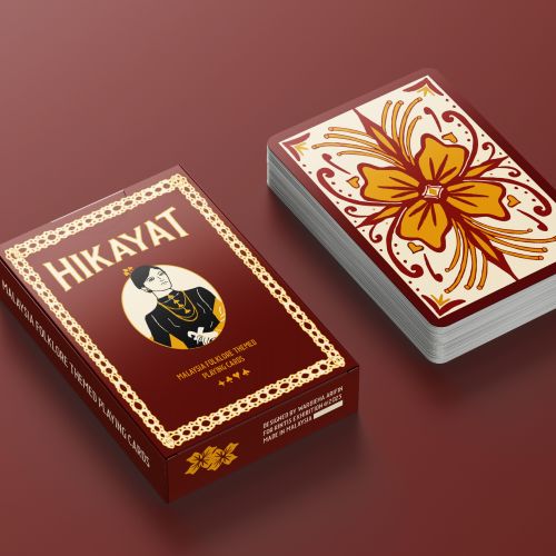 "Hikayat: Malaysia Folklore Playing Cards” is a distinctive set of playing cards infused with the rich heritage of Malaysia's folklore. This themed deck, comprising 52 cards, 2 Jokers, and an additional Info Card, transports players into the captivating world of legendary stories. Each suit unfolds a unique legacy, featuring characters like Puteri Hang Li Po, Puteri Lindungan Bulan, Puteri Gunung Ledang, and Puteri Walinong Sari. These cards take you from royal palaces to magical mountains, capturing the heart of Malaysian stories, creating a cultural experience for players. With every shuffle, the cards become a bridge to our roots, urging today's generation to embrace the enchanting stories and rich heritage that risk being forgotten. "Hikayat" isn't just a deck of playing cards; it's a deliberate step towards ensuring that the legacy of Malaysia's folklore remains alive in the hearts and minds of the current generations.