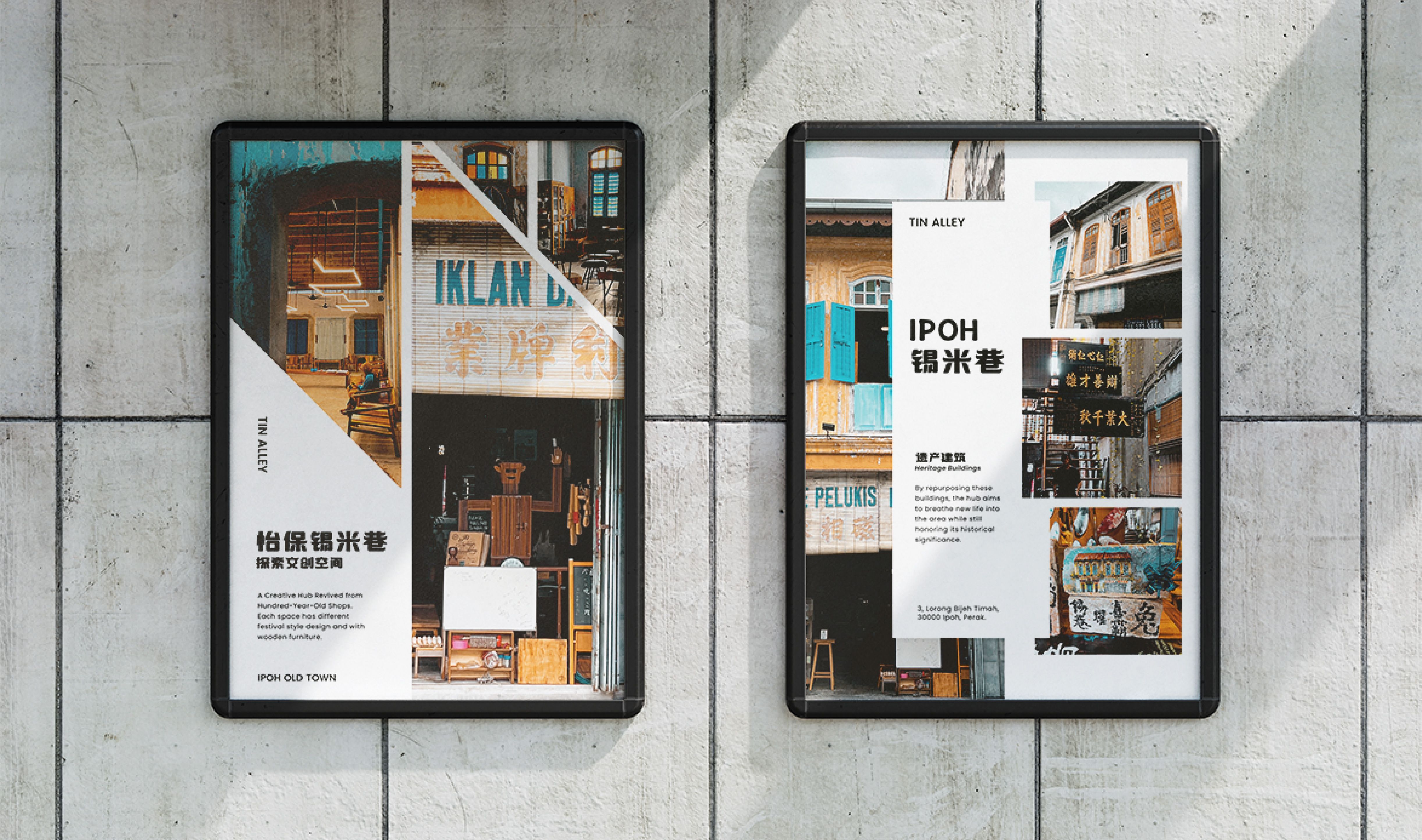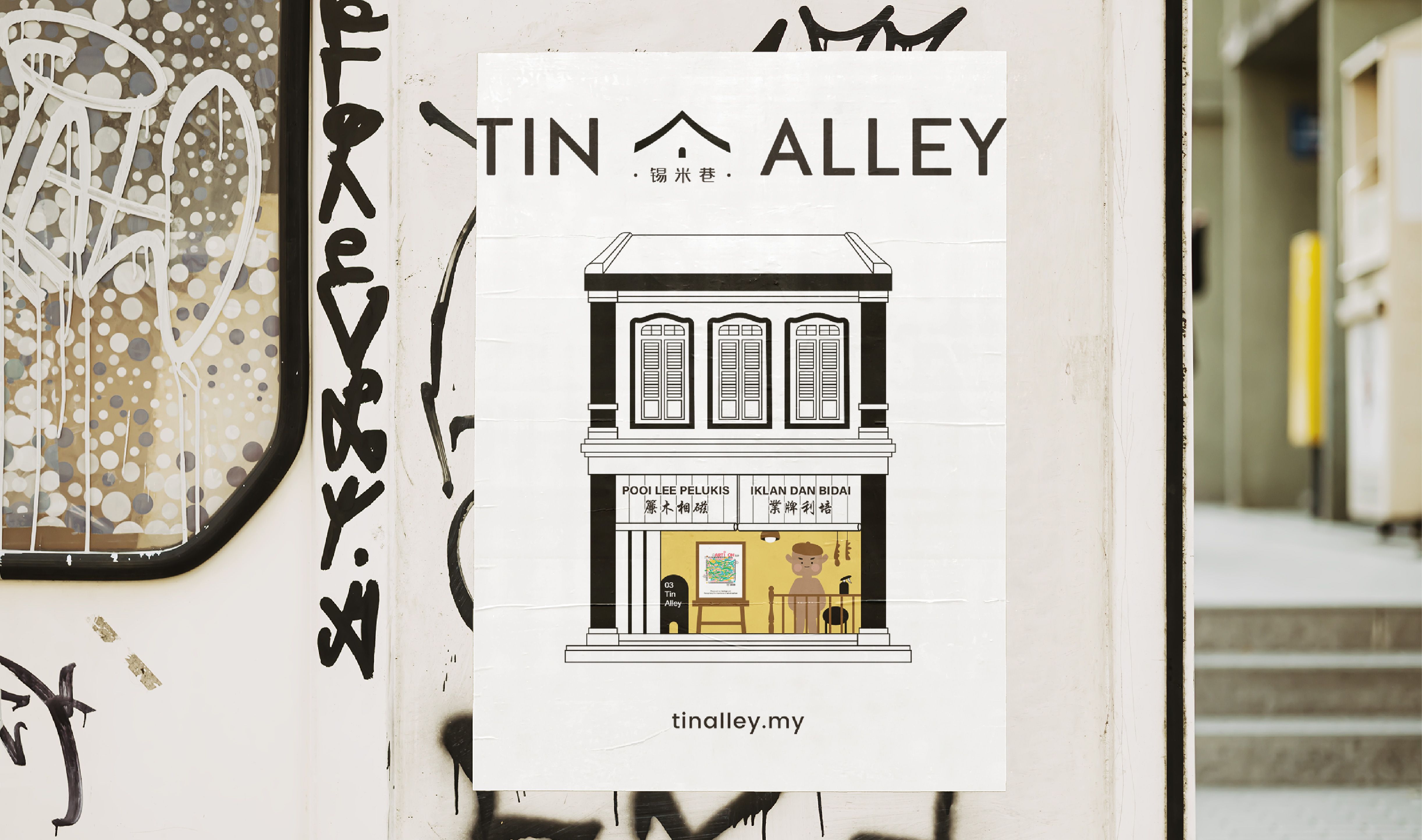 Since 2019, Tin Alley has emerged as a prominent creative hub for artists, creators, and enthusiasts alike. Nestled in the heart of Ipoh's Old Town, Tin Alley has become a vibrant center for artistic expression, cultural heritage preservation, and community engagement. A social awareness campaign is proposed for the creative hub, Tin Alley, encompassing a series of posters, merchandise, and website. It aims to raise awareness and attract more local people interested in the arts, culture, and heritage of Ipoh. Through a focused visual marketing and advertising strategy, our mission is to enhance brand recognition and clarify the creative hub's identity for a diverse audience.