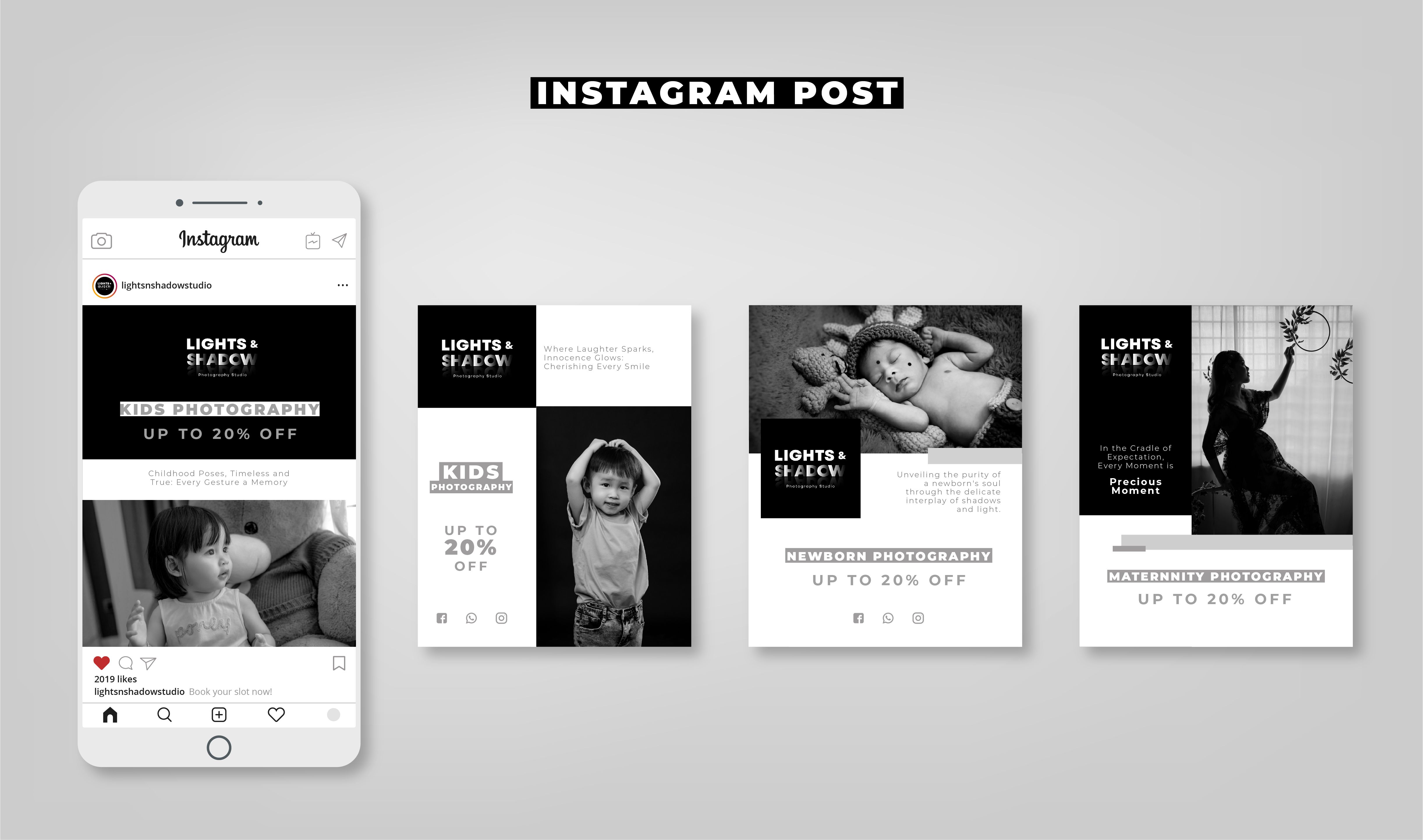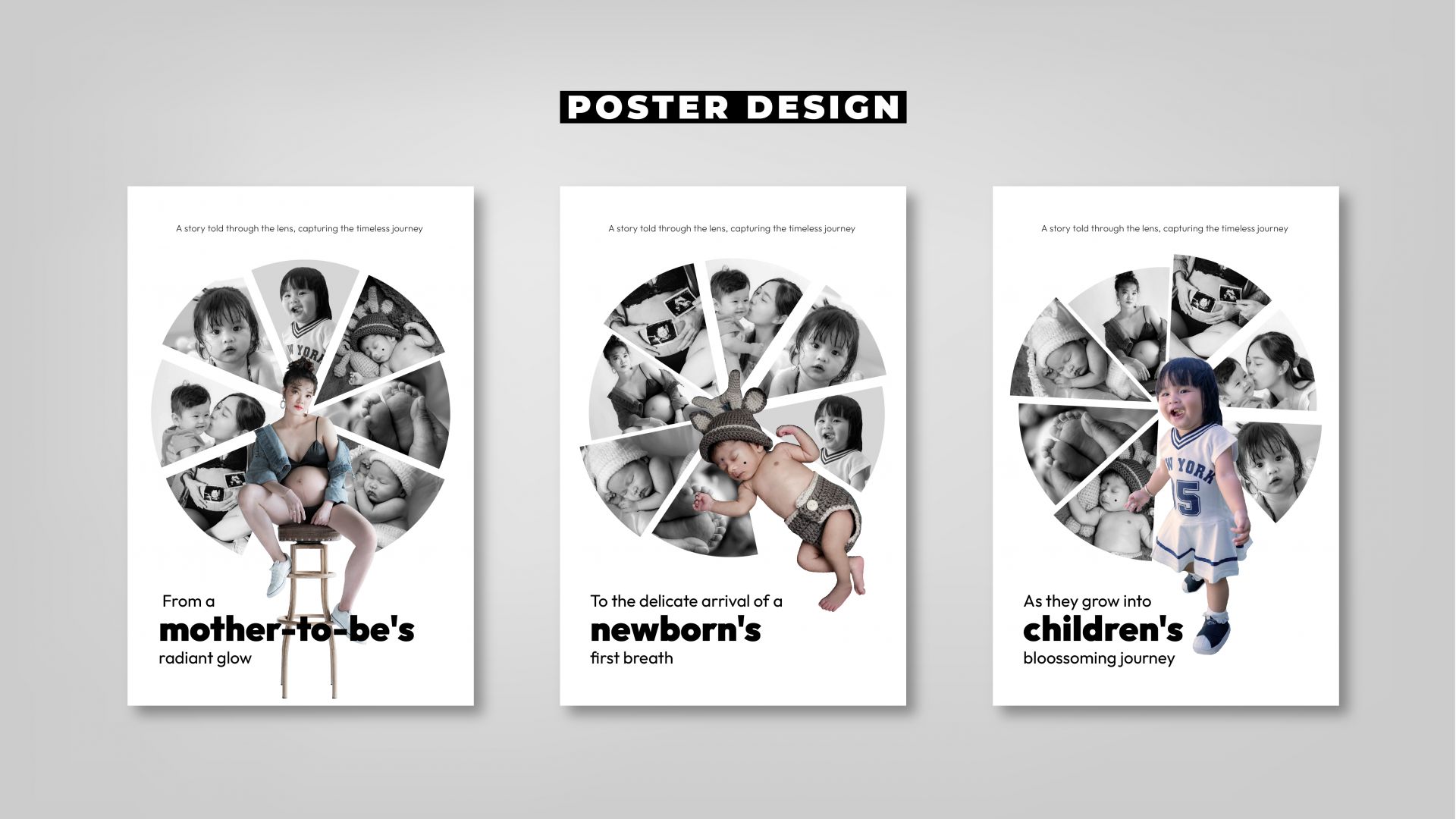 The aim of this project is to promote the studio’s services. This project mainly focuses on capturing moments of pregnant mothers, newborns and younger children. The goal is to highlight the photography studio’s professionalism and expertise in these fields.Additionally, the artworks in this project are presented in black and white tone to showcase the photographer's skill, using the simplest visual palette to evoke a unique visual experience. The slogan for this project is “ Capturing Moments, Creating Memories - Where Every Click Tells A Story”. The photography studio will convey and express the exclusive story for the client through the lenses.