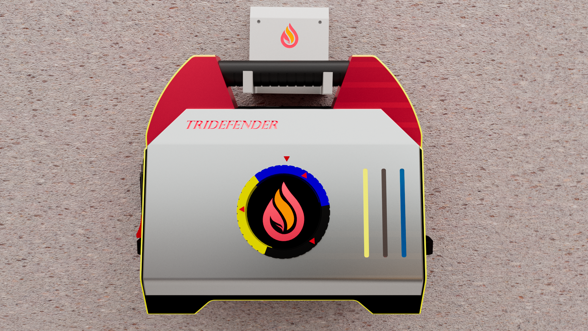 TriDefender is a design concept that revolutionizes fire safety with its innovative approach to extinguishing fires. This conceptual fire extinguisher breaks away from traditional models by incorporating a container-type design featuring three distinct tanks, each filled with a unique extinguishing agent. At the heart of TriDefender's ingenuity is its ability to rotate, allowing users to seamlessly choose the most effective agent based on the specific fire scenario. By providing a targeted response to different fire classes, from solids to liquids and electrical sources, Tridefender sets itself apart as a forward-thinking solution in the realm of fire safety.